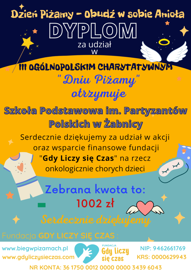 W ubiegły piątek uczniowie przyszli na lekcje  w szlafrokach i piżamach. Nie przywołało to jednak w nas senności. Wręcz przeciwnie, było mnóstwo energii i chęci do działania, a przede wszystkim wspierania dzieci w potrzebie. Dzięki szczodrości całej naszej Społeczności Szkolnej, zebraliśmy dla Fundacja Gdy Liczy się Czas 1️⃣0️⃣0️⃣2️⃣ zł.