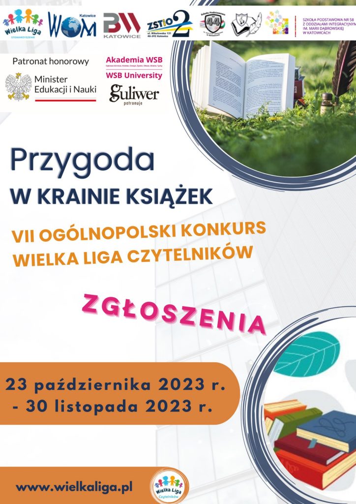 Zapraszamy wszystkich uczniów do wspólnej przygody z książką. Rusza WIELKA LIGA CZYTELNIKÓW! Zapraszamy do biblioteki szkolnej po „Kartę zgłoszenia”. Wszystkie informacje dostępne są na stronie szkoły: http://spzabnica.pl/wielka-liga-czytelnikow-2022-2023/ oraz w bibliotece szkolnej u pani Eweliny Banaś. SERDECZNIE ZAPRASZAMY!