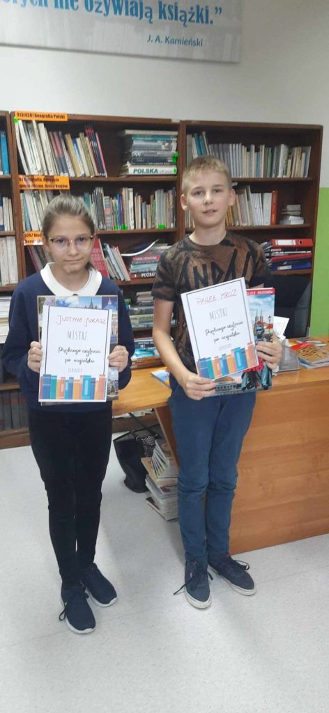 22 listopada 2023r. w bibliotece szkolnej odbył się konkurs językowy. Uczniowie w dwóch kategoriach walczyli o tytuł Mistrza pięknego czytania po angielsku. Cele konkursu: • Rozbudzanie wśród uczniów zainteresowań językiem angielskim. • Podniesienie poziomu umiejętności językowych. • Zainteresowanie literaturą obcą. • Zapoznanie uczniów z ofertą biblioteki szkolnej w zakresie literatury obcojęzycznej. Czytanie ze zrozumieniem jest ważną praktyczną umiejętnością, która przynosi uczniom dużo satysfakcji, umożliwia zdobywanie i poszerzanie wiedzy, utrwalenie leksyki i poznanie nowego słownictwa oraz stwarza możliwość bycia samodzielnym w nowych sytuacjach językowych. Głośne czytanie poprawia wymowę i intonację oraz płynność i tempo czytania. Mistrzem pięknego czytania w języku angielskim w kategorii kl. IV-V została: JUSTYNA JURASZ A w kategorii VI-VIII PAWEŁ MRÓZ. Na uczniów czekały cenne nagrody książkowe oraz niespodzianka w postaci filmu z pozdrowieniami od uczniów i nauczycieli z Portugalii, Słowacji, Chorwacji i Teneryfy. Film został przygotowany w ramach realizacji projektu Erasmus Plus. Gratulujemy i zachęcamy do czytania książek po angielsku.