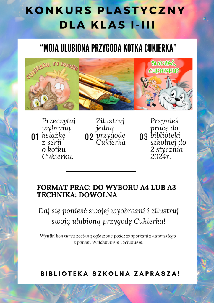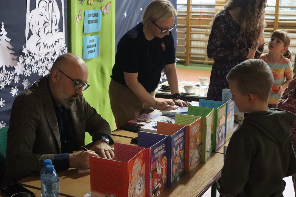 W dniu 03.01.2024r. w Naszej szkole gościliśmy pana Waldemara Cichonia – autora serii książek o zabawnych przygodach kota Cukierka. W czasie nietypowej lekcji uczniowie klas pierwszych i drugich mieli możliwość dowiedzieć się, skąd biorą się pomysły na pisanie kolejnych przygód rezolutnego zwierzaka. Autor podzielił się z uczniami swoją pasją do pisania, zachęcał do twórczości literackiej, czytania książek, przeczytał na wizji jedną z opowieści o kocie psotniku oraz odpowiedział na wszystkie pytania zadane przez uczniów, opowiedział również, jakie są etapy powstawania książek i kto musi nad nimi pracować, aby mogły trafić do księgarni lub biblioteki. Podczas spotkania Pan Waldemar wręczył nagrody w konkursie plastycznym organizowanym przez bibliotekę szkolną. Miejsce I – Helena Kosiec z kl. III a Miejsce II – Tymoteusz Witos z kl. I b Miejsce III- Julia Ryżka z kl. I b Chętni uczniowie mieli możliwość zakupu pamiątkowego egzemplarza z imienną dedykacją i autografem autora. Zachęcamy do przeczytania wszystkich części niewiarygodnych przygód psotnego kotka, które czekają na Was w bibliotece szkolnej.
