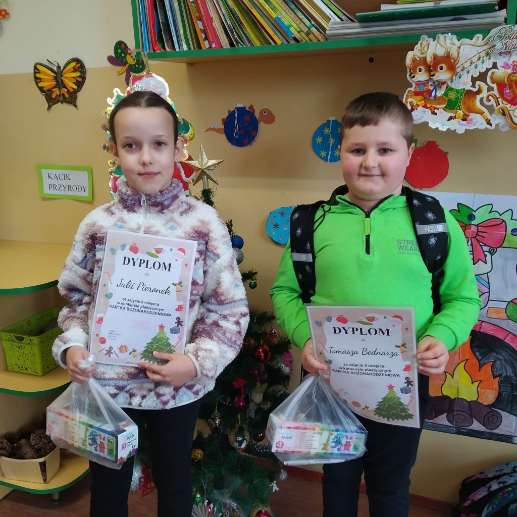 KARTKA BOŻONARODZENIOWA rozstrzygnięty! W dniu 14.12.2022r. rozstrzygnięty został konkurs plastyczny dla klas I-III KARTKA BOŻONARODZENIOWA. Wszyscy uczestnicy konkursu wykazali się wielką kreatywnością i pomysłowością. Zgłoszonych zostało wiele pięknych prac, przez co jury nie miało łatwego zadania w wyłonieniu zwycięzców. Wyniki konkursu: I MIEJSCE – Oliwia Pawlus kl.2a i Aleksandra Bury kl.2b II MIEJSCE – Julia Pieronek kl.3a i Tomasz Bednarz kl.1a III MIEJSCE – Piotr Urbaś kl.1b i Jakub Chowaniec kl. 3b WYRÓŻNIENIA Amelia Motyka kl.1b Mikołaj Górski kl. 1b Viktoria Slobodian kl.1b Julia Kupczak kl.1b Anita Biegun kl. 2b Helena Kosiec kl. 2a Wszystkim zwycięzcom jeszcze raz serdecznie gratulujemy! Prace naszych uczniów można zobaczyć na szkolnym korytarzu. K. Gałuszka-Włoch