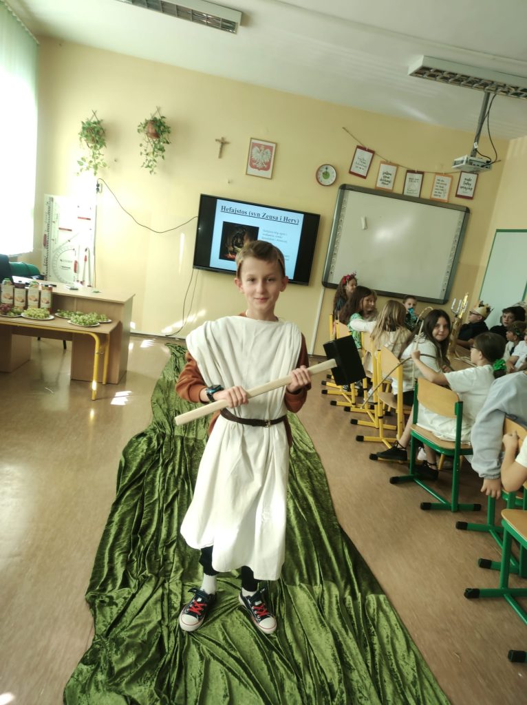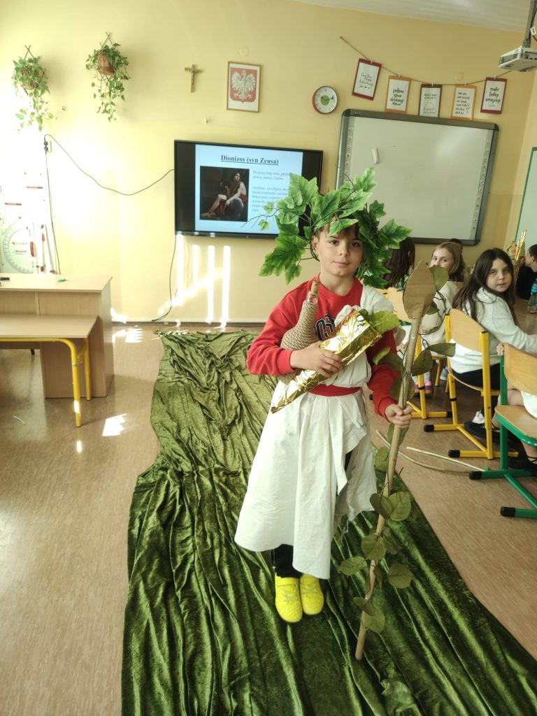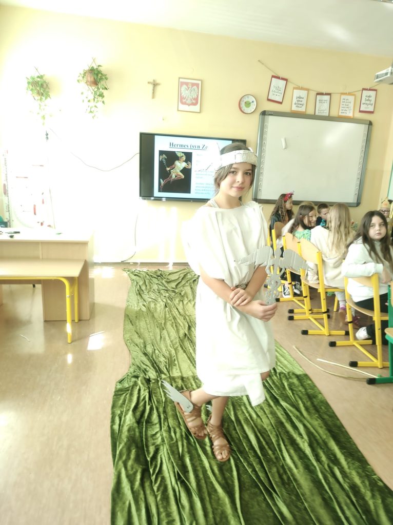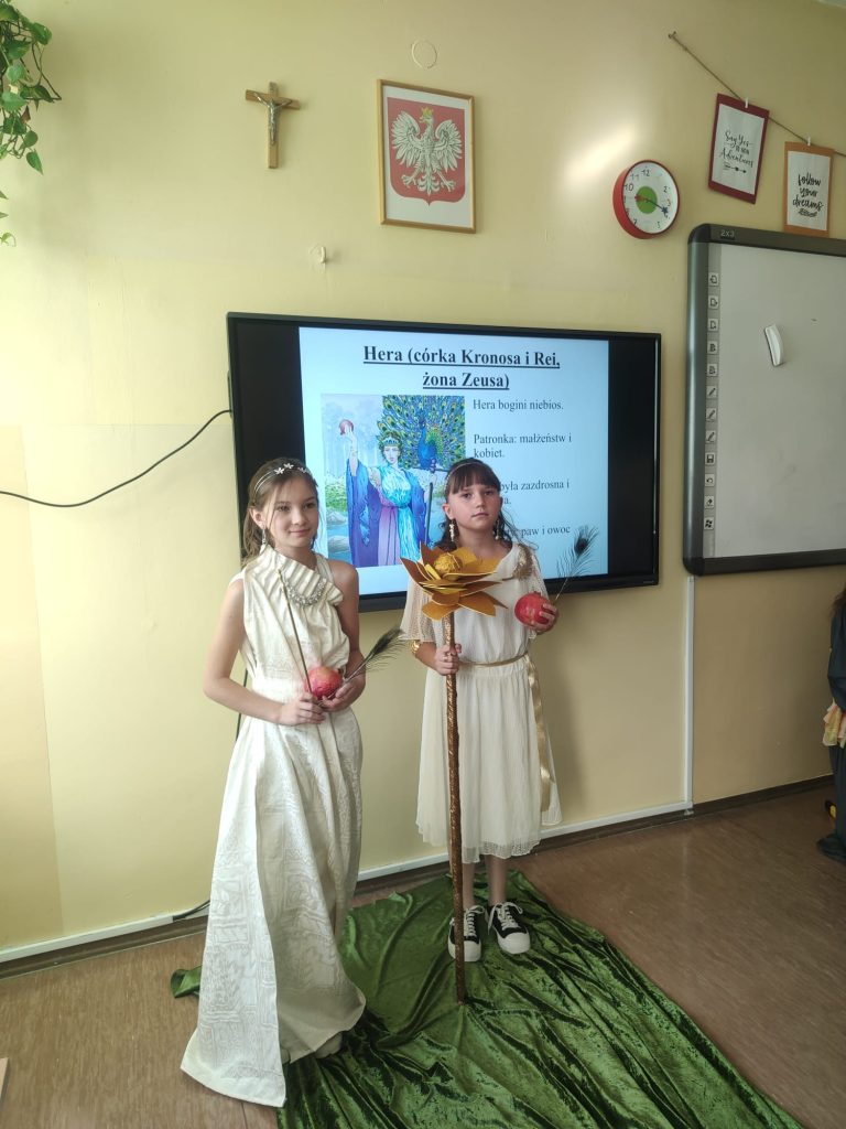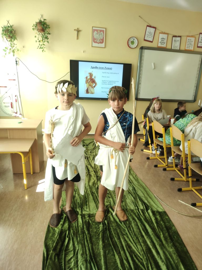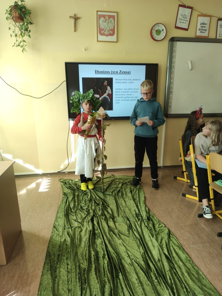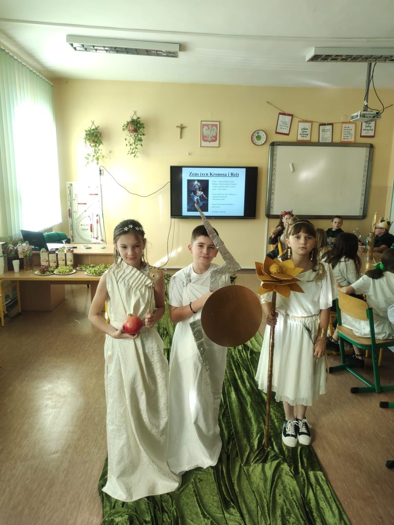 Uczniowie i uczennice klas piątych wzięli udział w interdyscyplinarnym projekcie z języka polskiego i historii. Nasze niecodzienne zajęcia dotyczyły bogów greckich i mitologii. Szkoła zamieniła się w Olimp, gdzie królowali bogowie i boginie. Wśród zaszczytnych gości nie brakowało najsłynniejszych herosów i tytanów. Uczniowie w pięknych strojach przeszli po dywanie niczym podczas pokazu antycznej mody. Następnie rozpoczęła się uczta, na której serwowano nektar i ambrozję.
