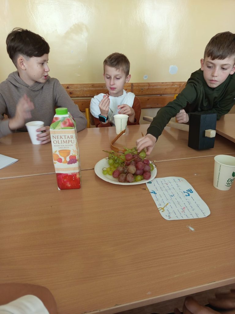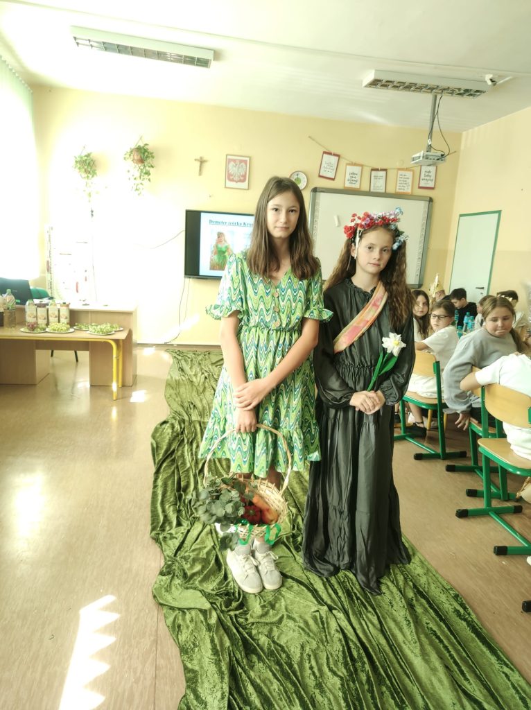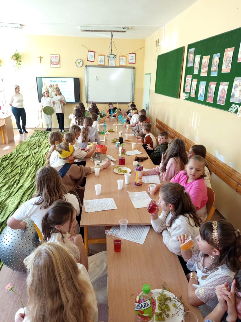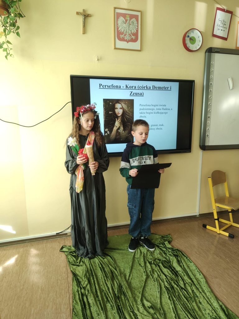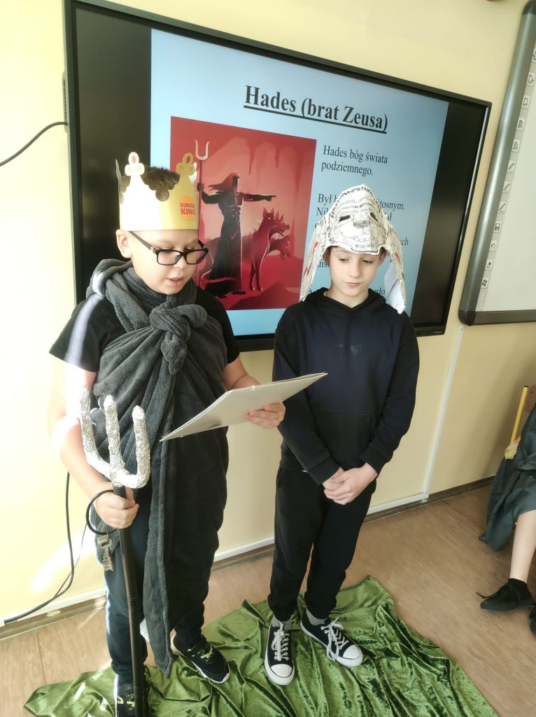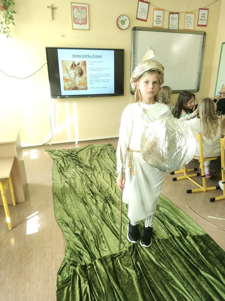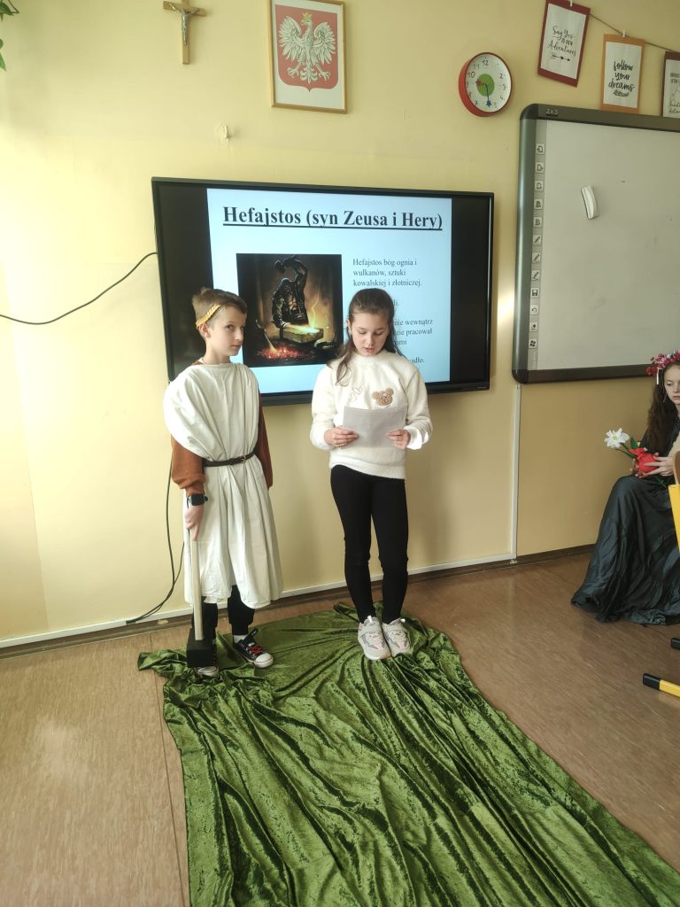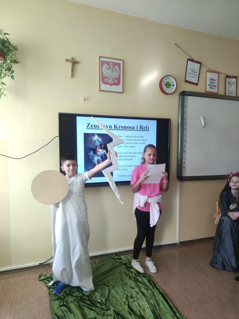 Uczniowie i uczennice klas piątych wzięli udział w interdyscyplinarnym projekcie z języka polskiego i historii. Nasze niecodzienne zajęcia dotyczyły bogów greckich i mitologii. Szkoła zamieniła się w Olimp, gdzie królowali bogowie i boginie. Wśród zaszczytnych gości nie brakowało najsłynniejszych herosów i tytanów. Uczniowie w pięknych strojach przeszli po dywanie niczym podczas pokazu antycznej mody. Następnie rozpoczęła się uczta, na której serwowano nektar i ambrozję.