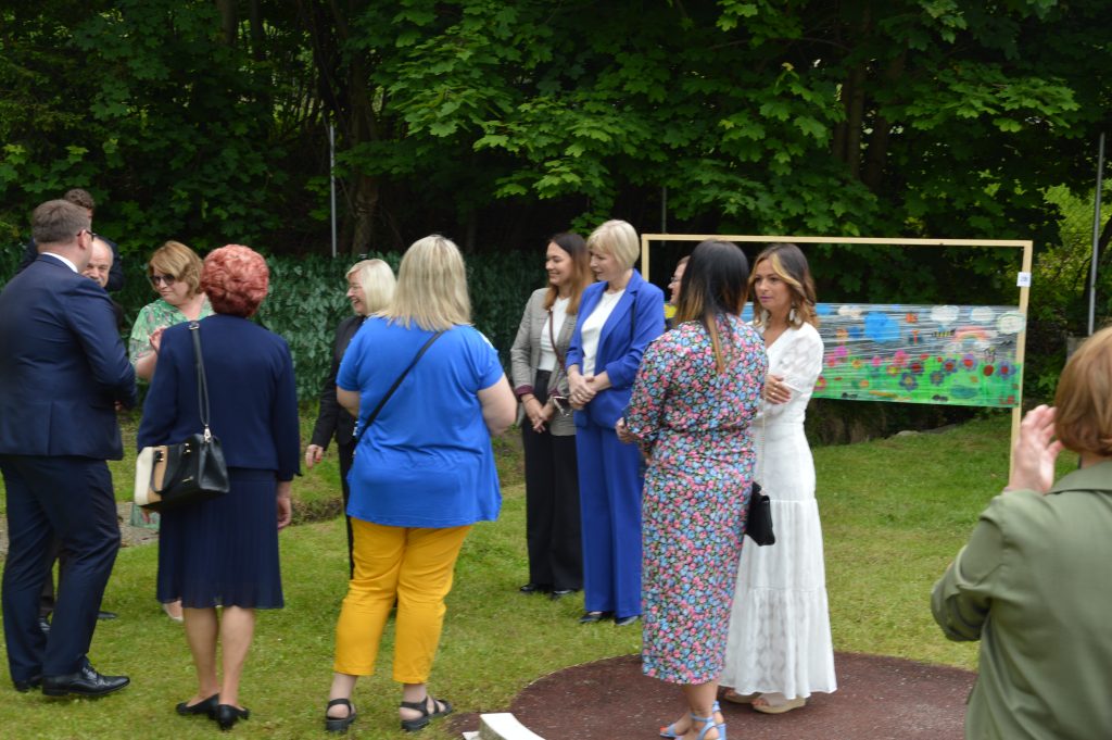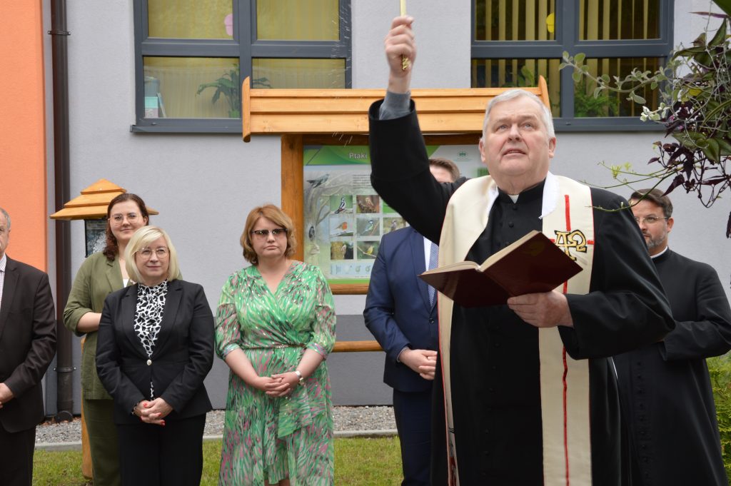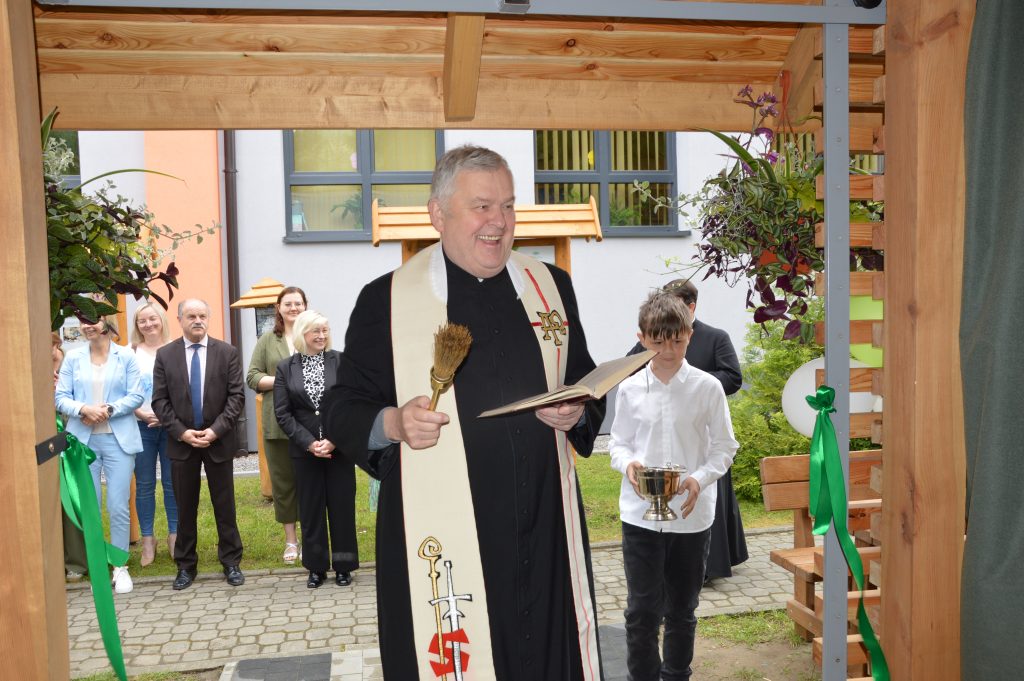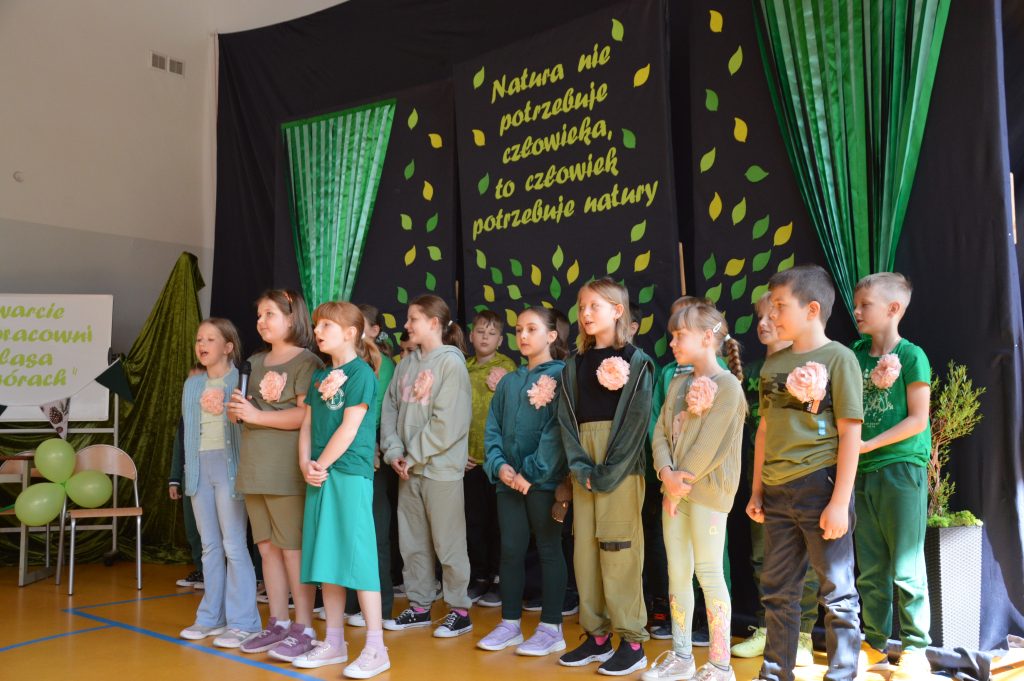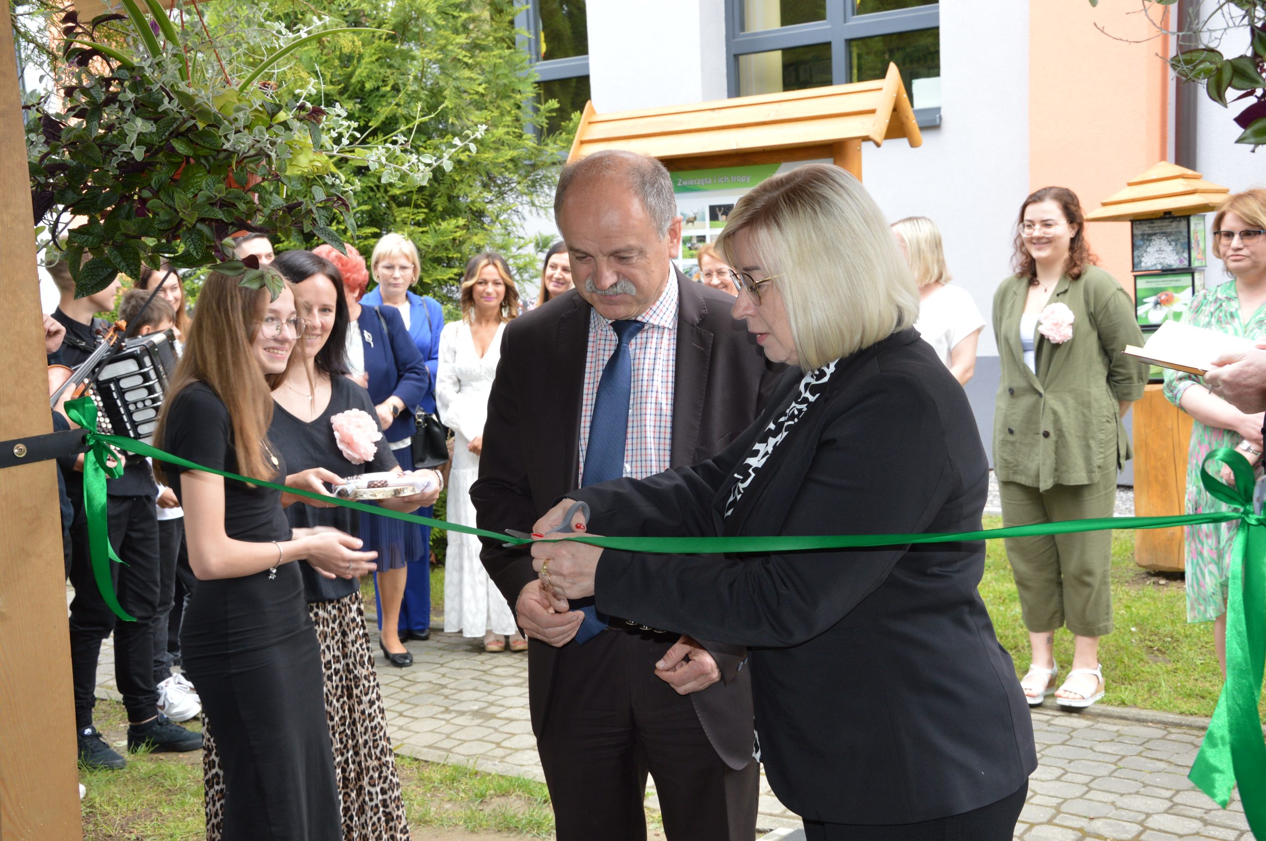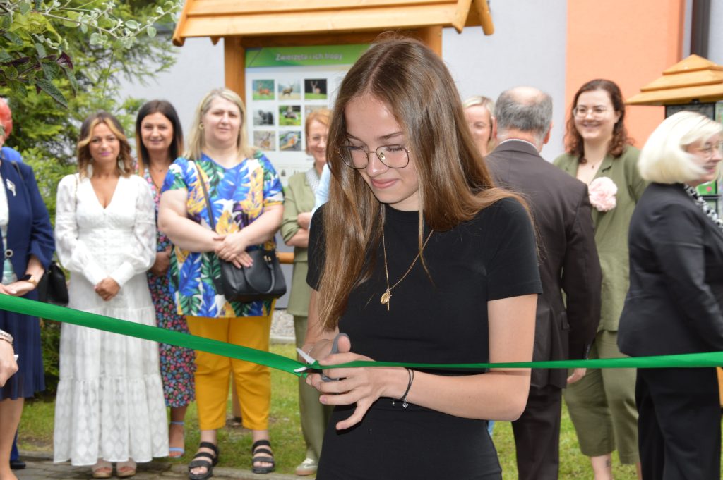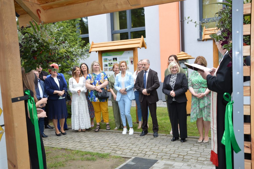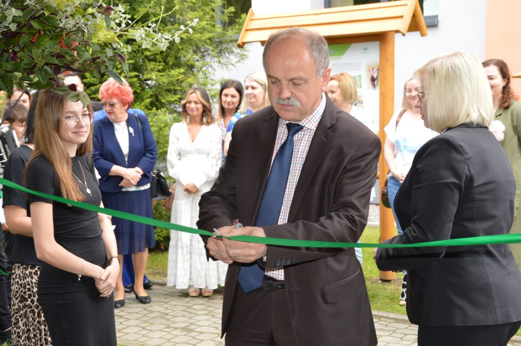 Po części artystycznej wszyscy goście udali się na zewnątrz, gdzie nastąpiło uroczyste przecięcie wstęgi i symboliczne otwarcie Ekopracowni. Uczniowie z dumą prezentowali efekty swojej pracy – własnoręcznie wykonane donice z ziołami i pięknie ukwiecone rabaty.